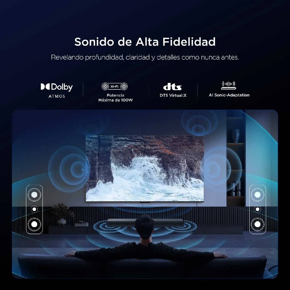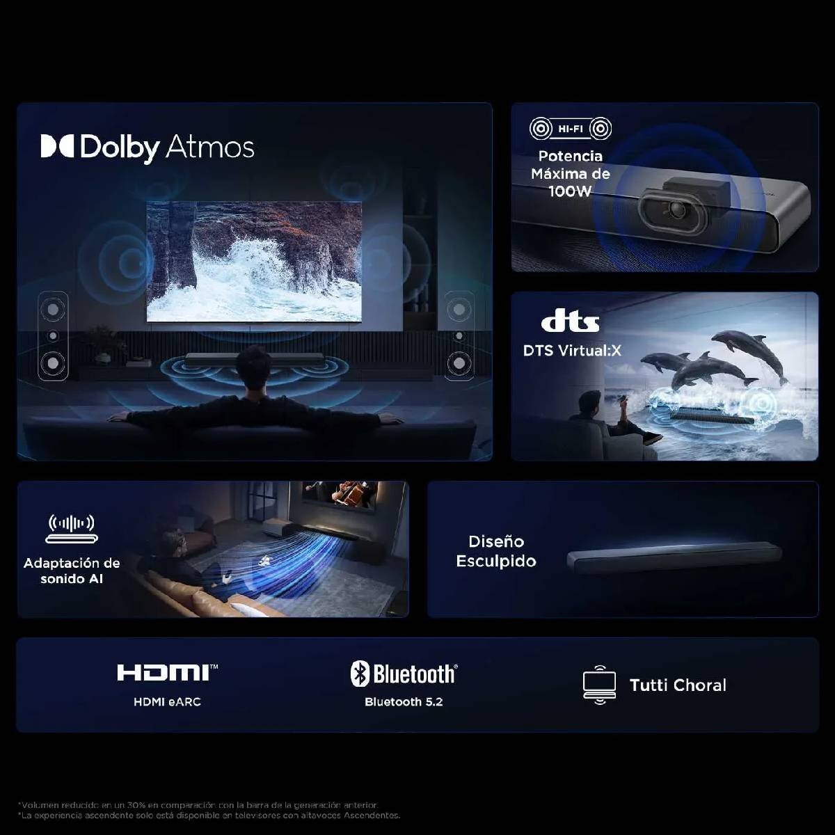 | Características Adicionales | Sistema de Bajos Dual – Cámaras de Eco de Doble Bocina – Tutti Choral – DTS Virtual:X – Calibración de sonido óptima – Modos de sonido especializados – Sonido Adaptativo con IA – HDMI 2.0 con eARC |