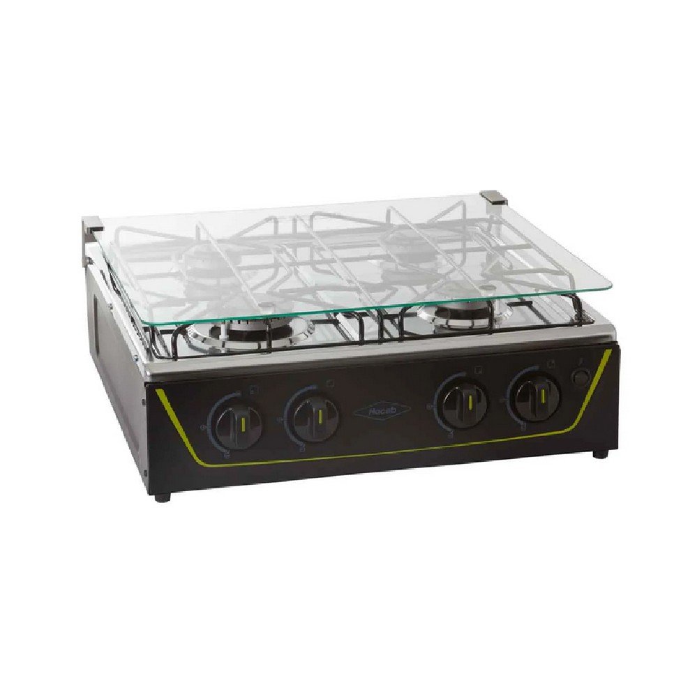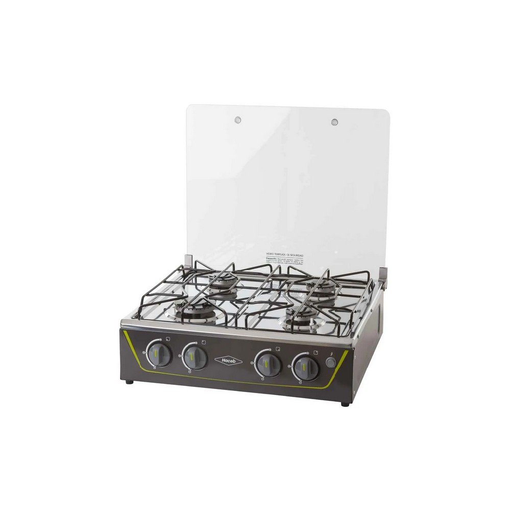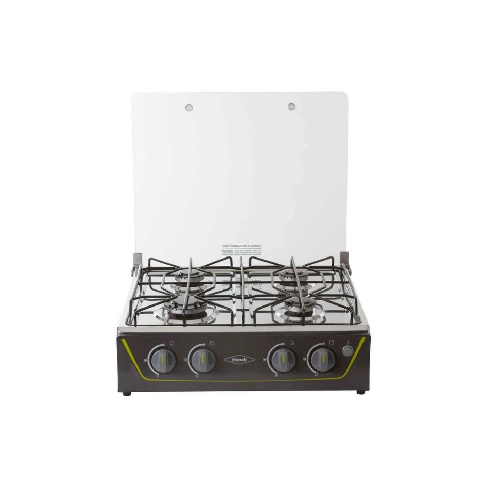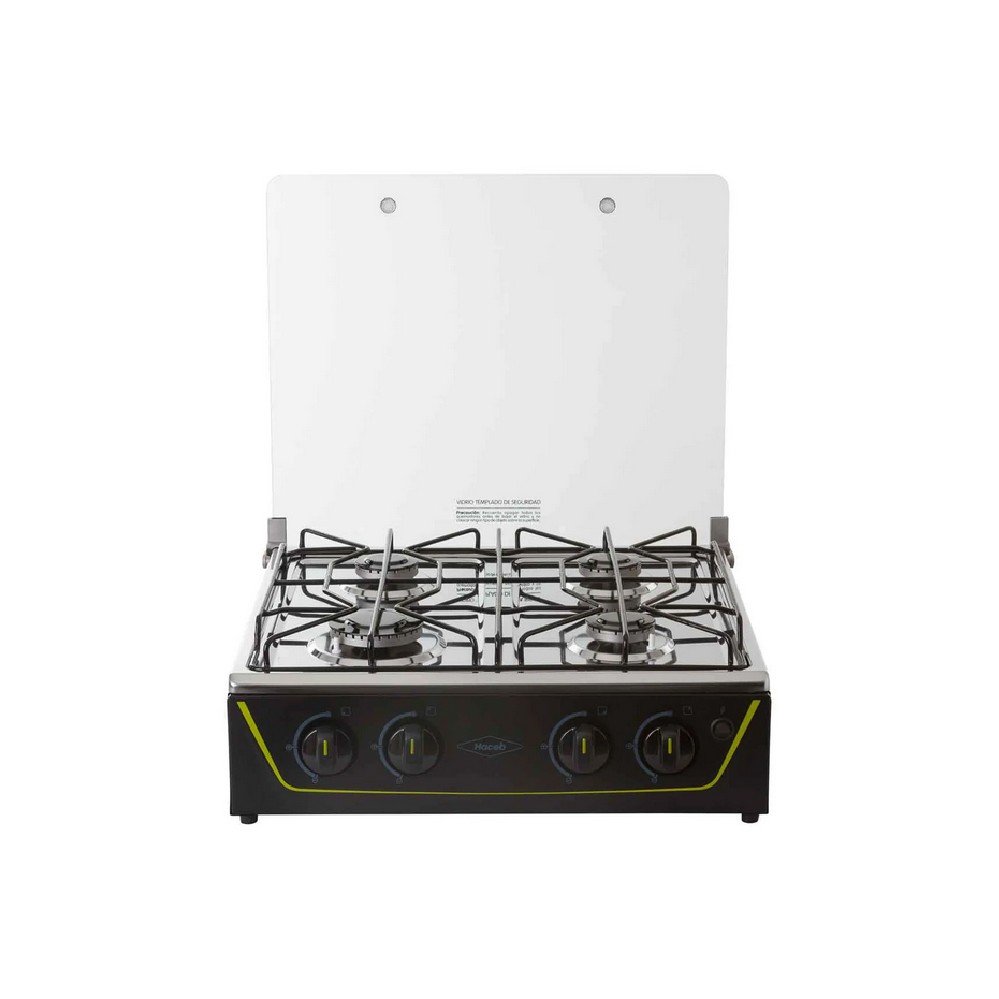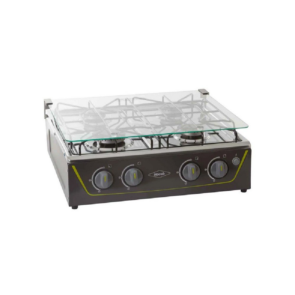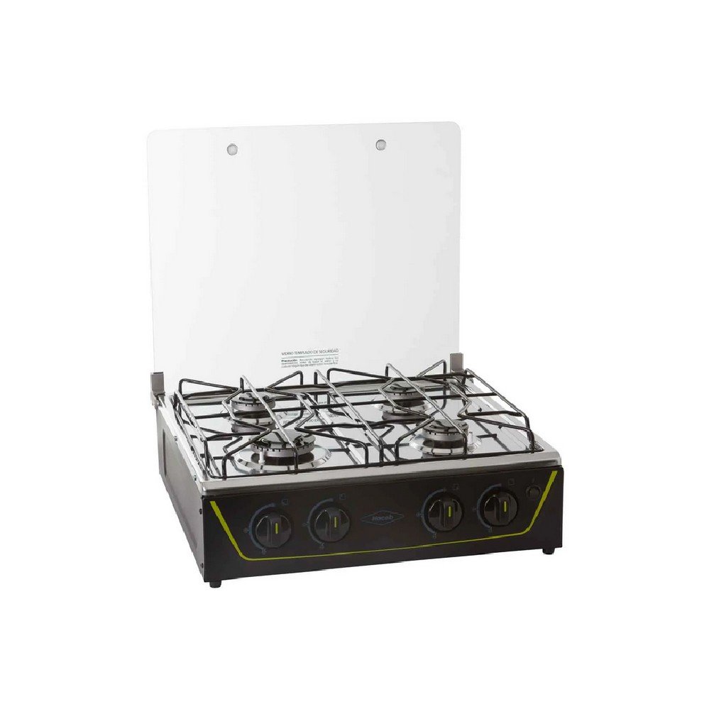 Estufa de mesa en acero inoxidable con fuentes de calor de diferentes tamaños, parrilla en alambrón, vidrio superior templado que protege de salpicaduras y con una robusta estructura inferior.