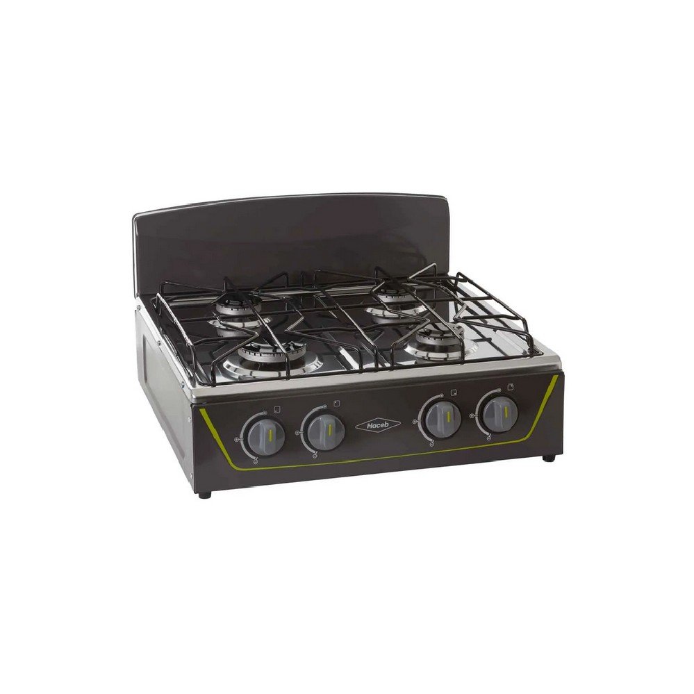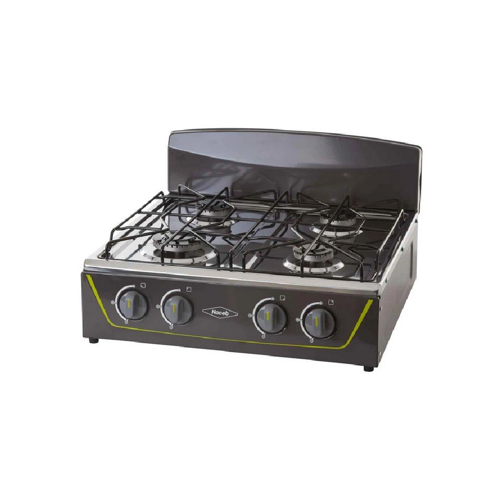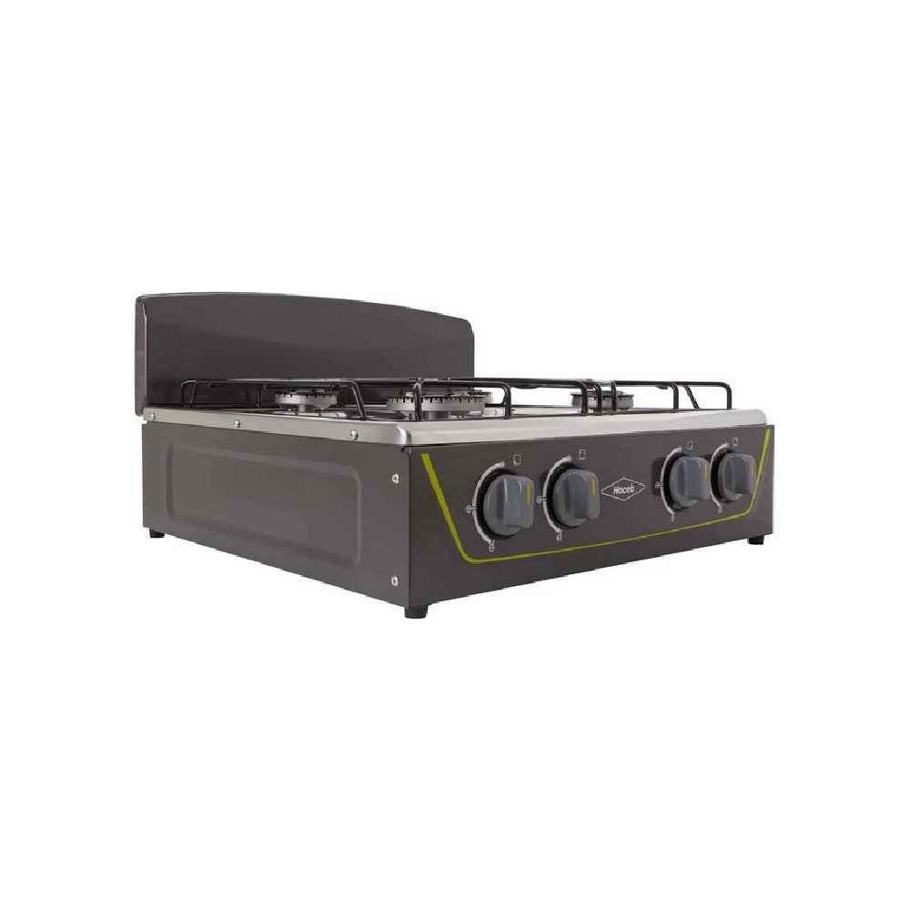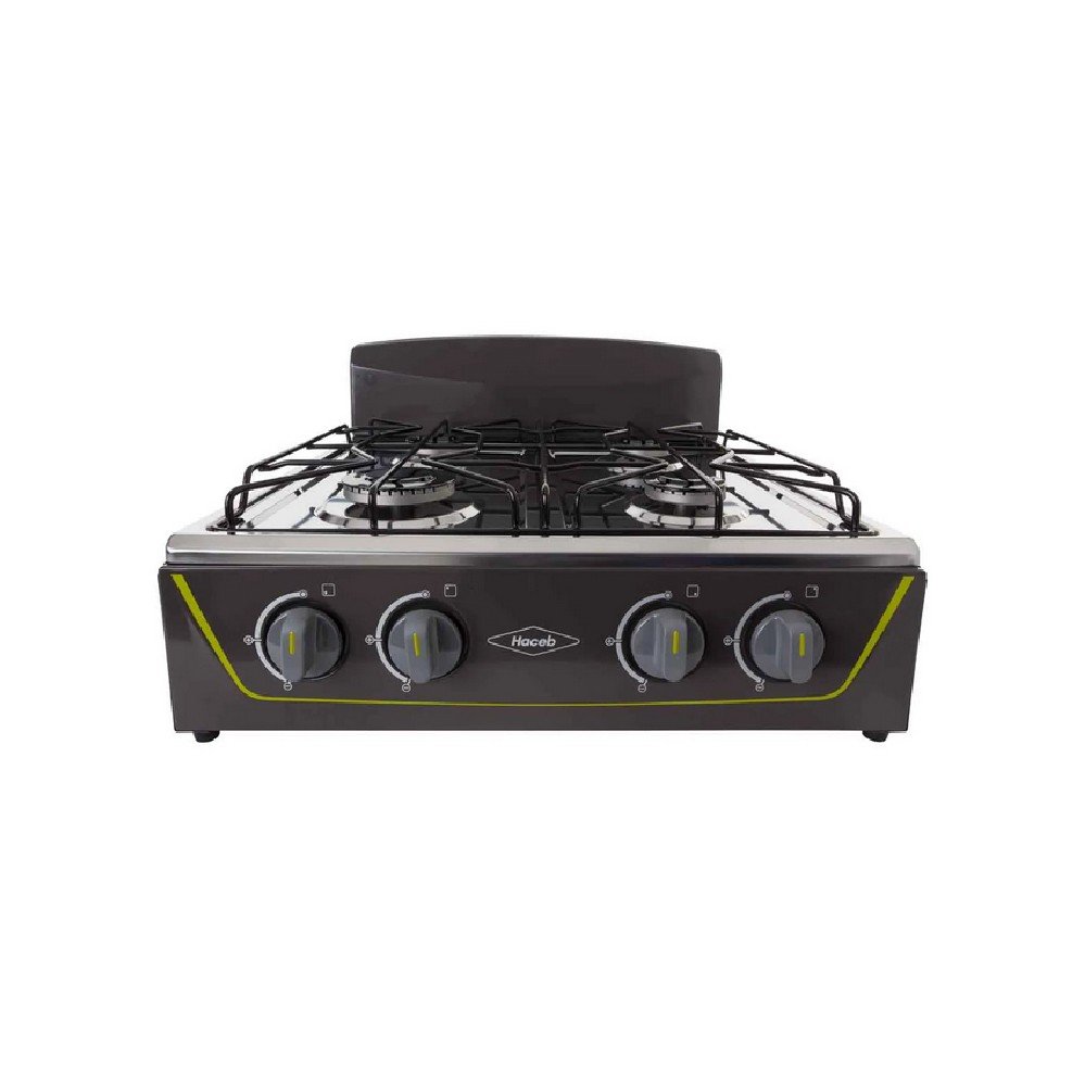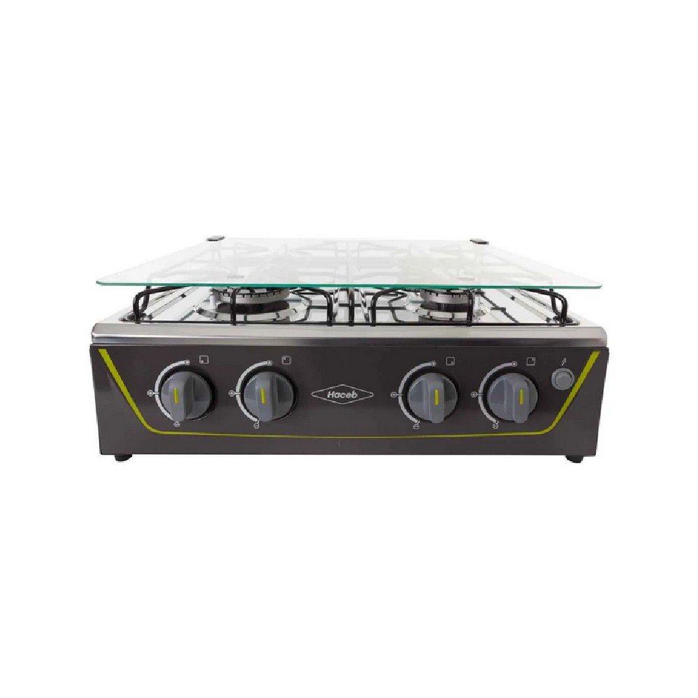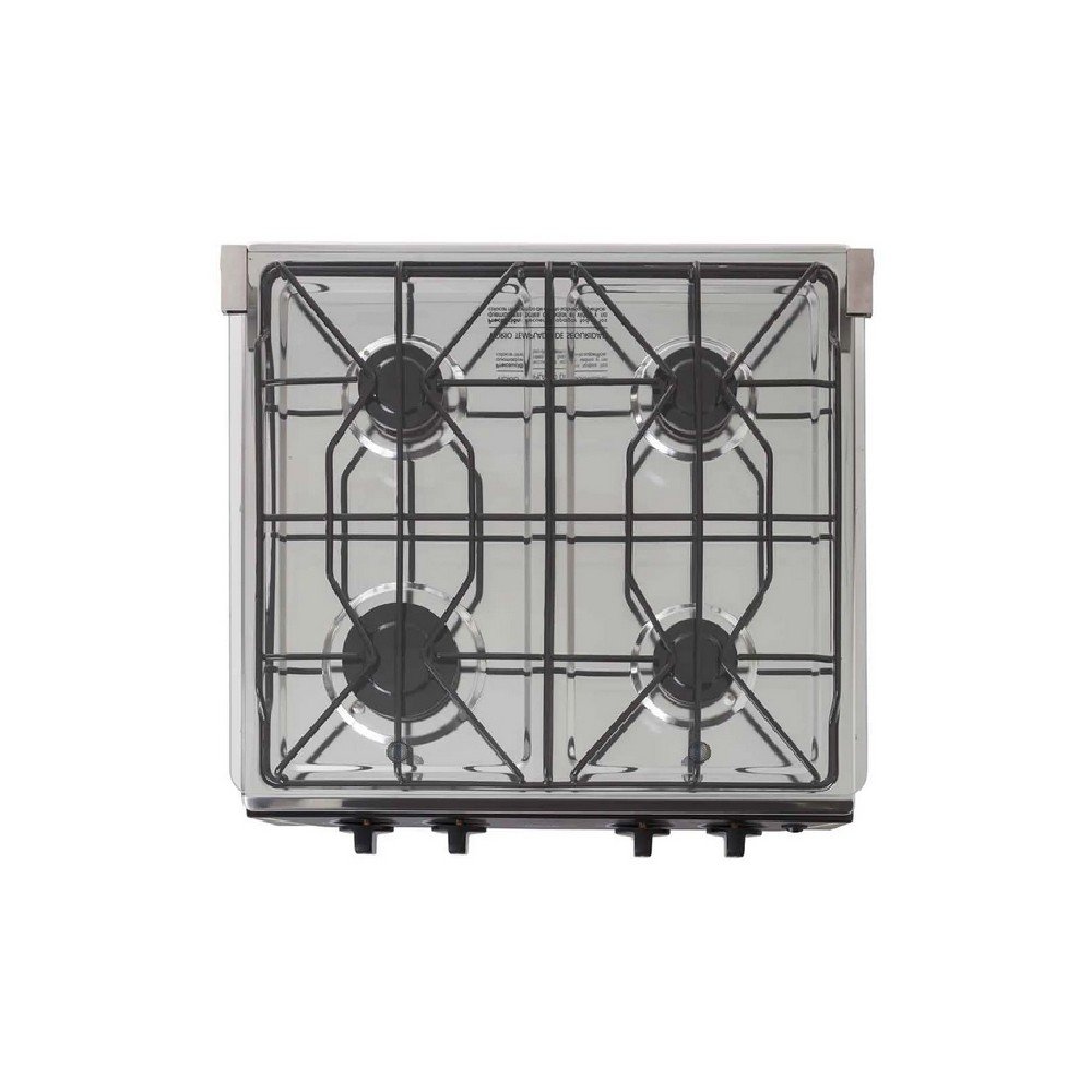 Estufa de mesa en acero inoxidable con fuentes de calor de diferentes tamaños, parrilla en alambrón, vidrio superior templado que protege de salpicaduras y con una robusta estructura inferior.