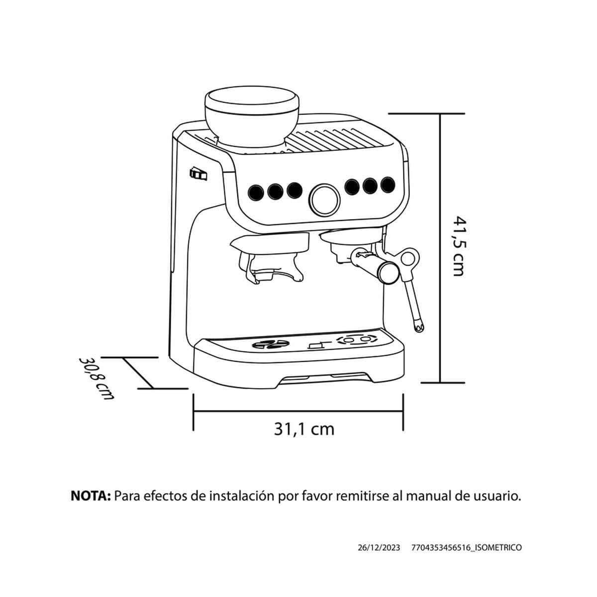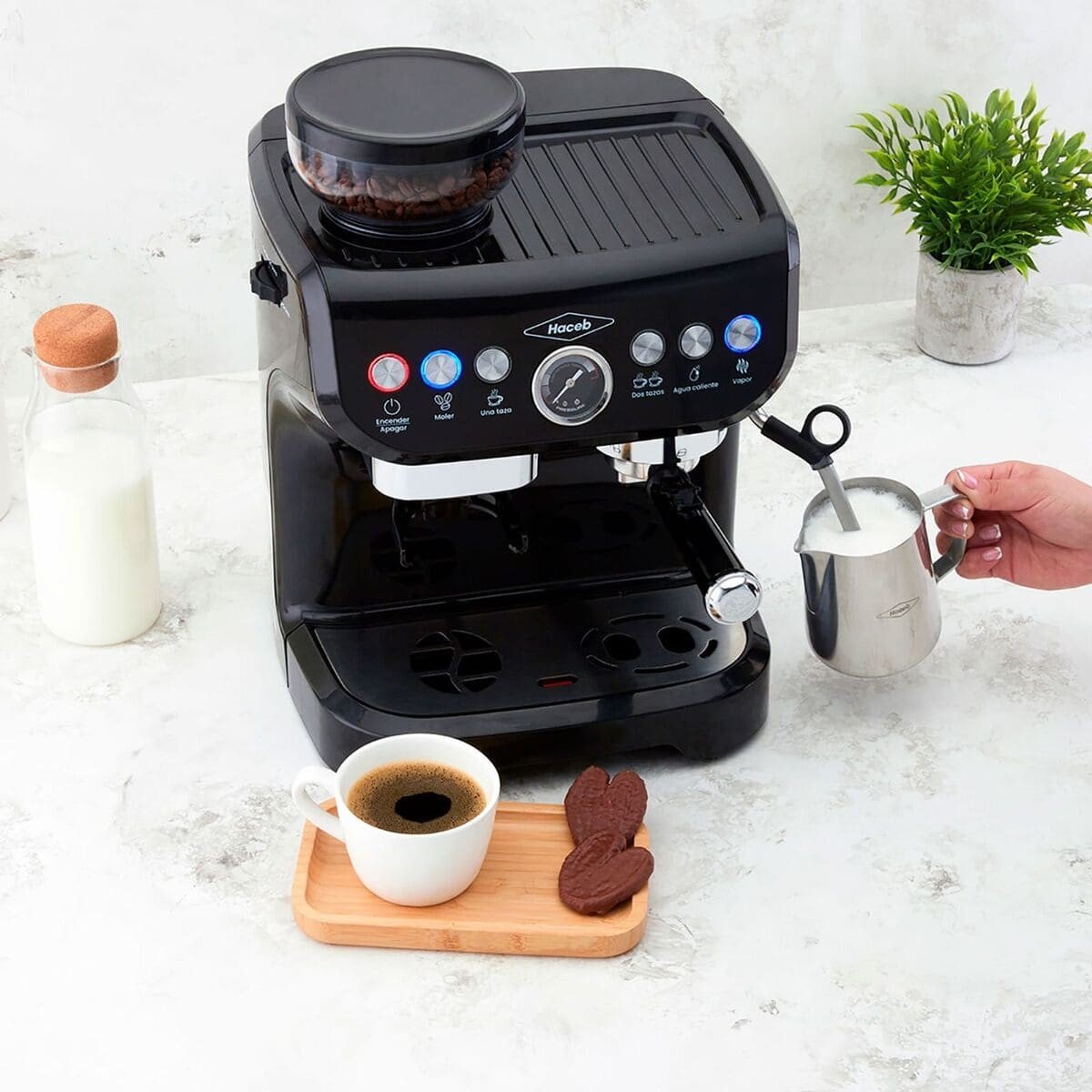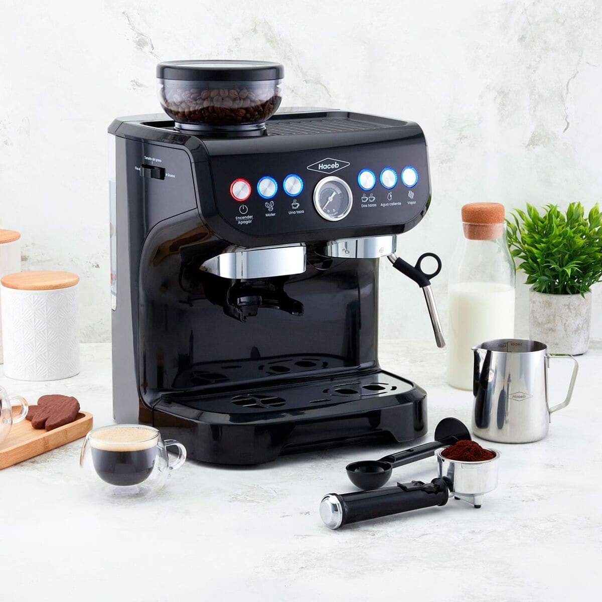 La Máquina de Café Haceb con Molino Integrado, Te permite disfrutar de las mejores bebidas calientes en casa, capacidad de 19 bares de presión, almacena hasta 150 gramos de café en grano conservando su aroma y sabor, además, cuenta con un portafiltro que permite tener diferentes tipos de molienda, desde una muy fina hasta más gruesa. Con el panel de control puedes programar diferentes funciones (moler, una taza, dos tazas, agua caliente, vapor y encendido/apagado), logra superficies suaves y espumosas con el tubo de vapor para microespuma. Conviértete en un experto del café gracias a sus características prácticas de uso y dale un toque de elegancia y sofisticación a tu espacio favorito con su acabado en color negro.