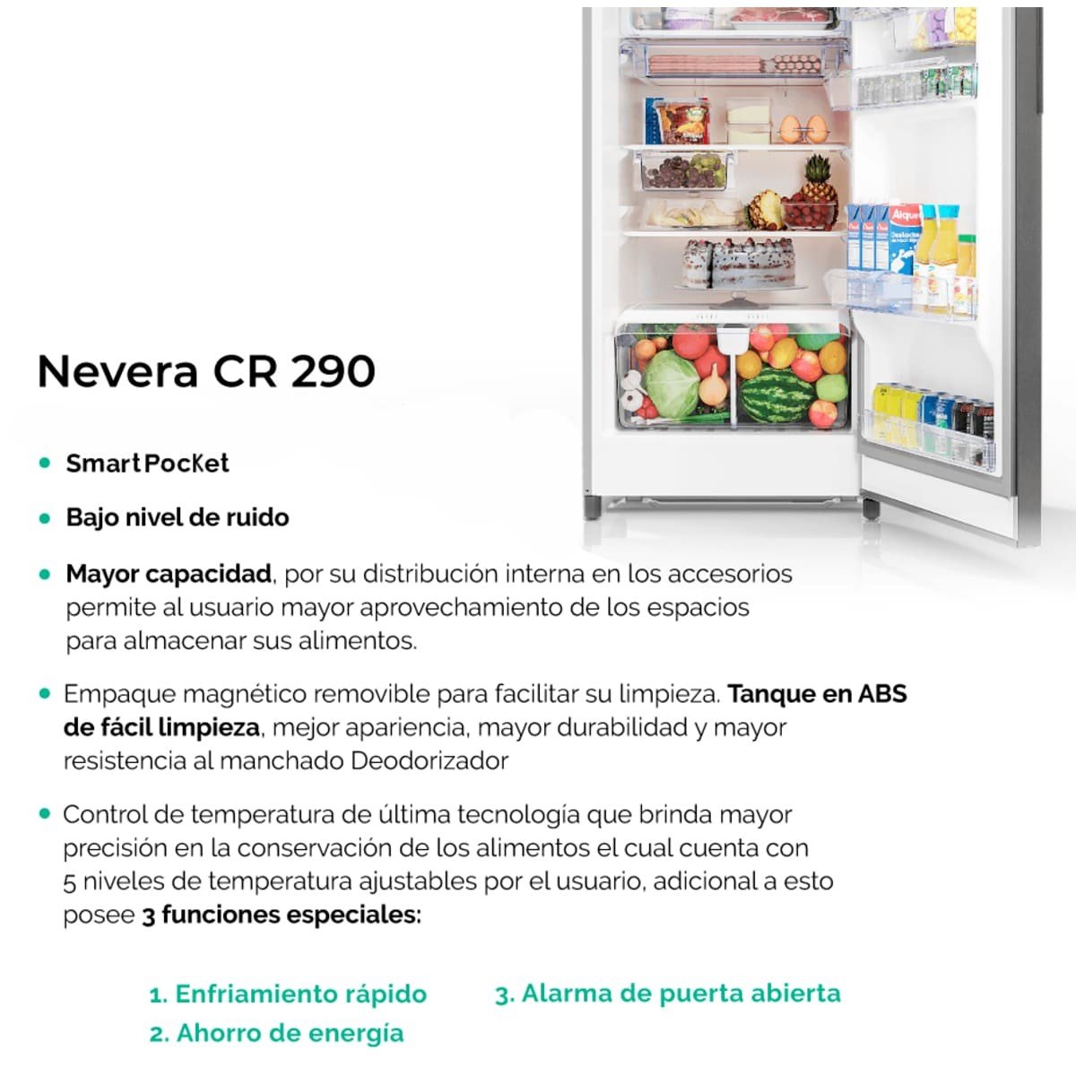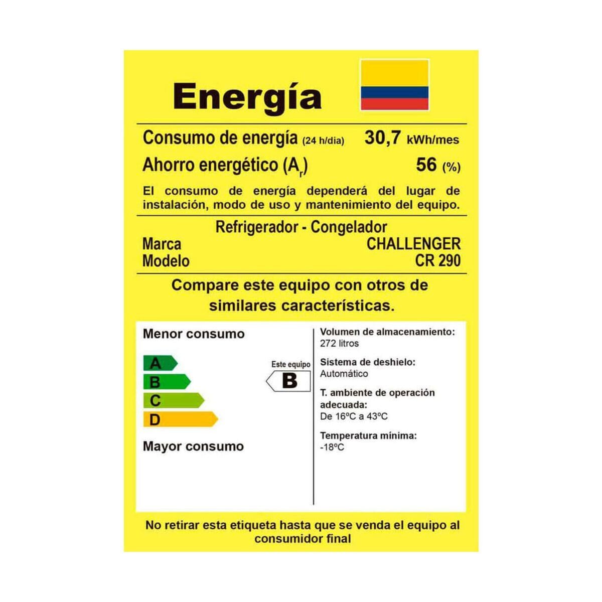 Nevera Challenger LUMINA 290 Lt Titanium CR-290 TIT 100% Ecológica Contiene refrigerante R600a que conlleva a una mayor eficiencia energética y reduce el riesgo del impacto sobre el calentamiento global y el daño a la capa de ozono. Adicional es Libre de CFC (Clorofluorocarburos) Sistema Multiflow Sistema multiflujo el cual realiza una distribución constante y uniforme de la temperatura para mantener los alimentos mas frescos. , Nuevas bandejas vidrio templado de seguridad Bandeja multiusos extraíble, de fácil acceso que permite almacenar diferentes alimentos, contiene nuevos anaqueles pocket modulares para mejorar la distribución de alimentos en la puerta. , Bajo consumo energético Bajo consumo energético con las funciones del control electrónico de temperatura. Clasificación Energética B Consumo de Energía: 30.7 KWh/mes VENTAJAS ADICIONALES: Descongelación semiautomática. Mayor capacidad. Tanque en ABS de fácil limpieza, mejor apariencia, mayor durabilidad y mayor resistencia al manchado. Con refrigerante R600a que conlleva a una mayor eficiencia energética y reduce el riesgo del impacto sobre el calentamiento global y el daño a la capa de ozono (Características alineadas con el compromiso ambiental del producto). Separador de alimentos en el compartimiento de frutas y verduras. Cuerpo exterior en lámina galvanizada. Empaque magnético removible para facilitar su limpieza. Bandeja multiusos extraíble, de fácil acceso que permite almacenar diferentes alimentos. Dispensador de agua con fácil acceso. Bandejas en vidrio templado de seguridad. 100% ecológica – libre de CFC. Bajo nivel de ruido. Control de temperatura de última tecnología que brinda mayor precisión en la conservación de los alimentos el cual cuenta con 5 niveles de temperatura ajustables por el usuario, adicional a esto posee 4 funciones especiales: 1. Enfriamiento rápido 2. Ahorro de energía 3. Alarma de puerta abierta 4. Descongelación Bajo consumo energético con las funciones del control electrónico de temperatura. Anaqueles pocket modulares para mejorar la distribución de alimentos en la puerta. Rodachinas para facilitar el desplazamiento de la nevera. *Especificaciones e imágenes sujetas a cambios sin previo aviso , Compras Seguras Online en Grupo Mansión. Encuentra más productos relacionados en la categoría neveras Para mayor información sobre el producto ingresa aquí ,