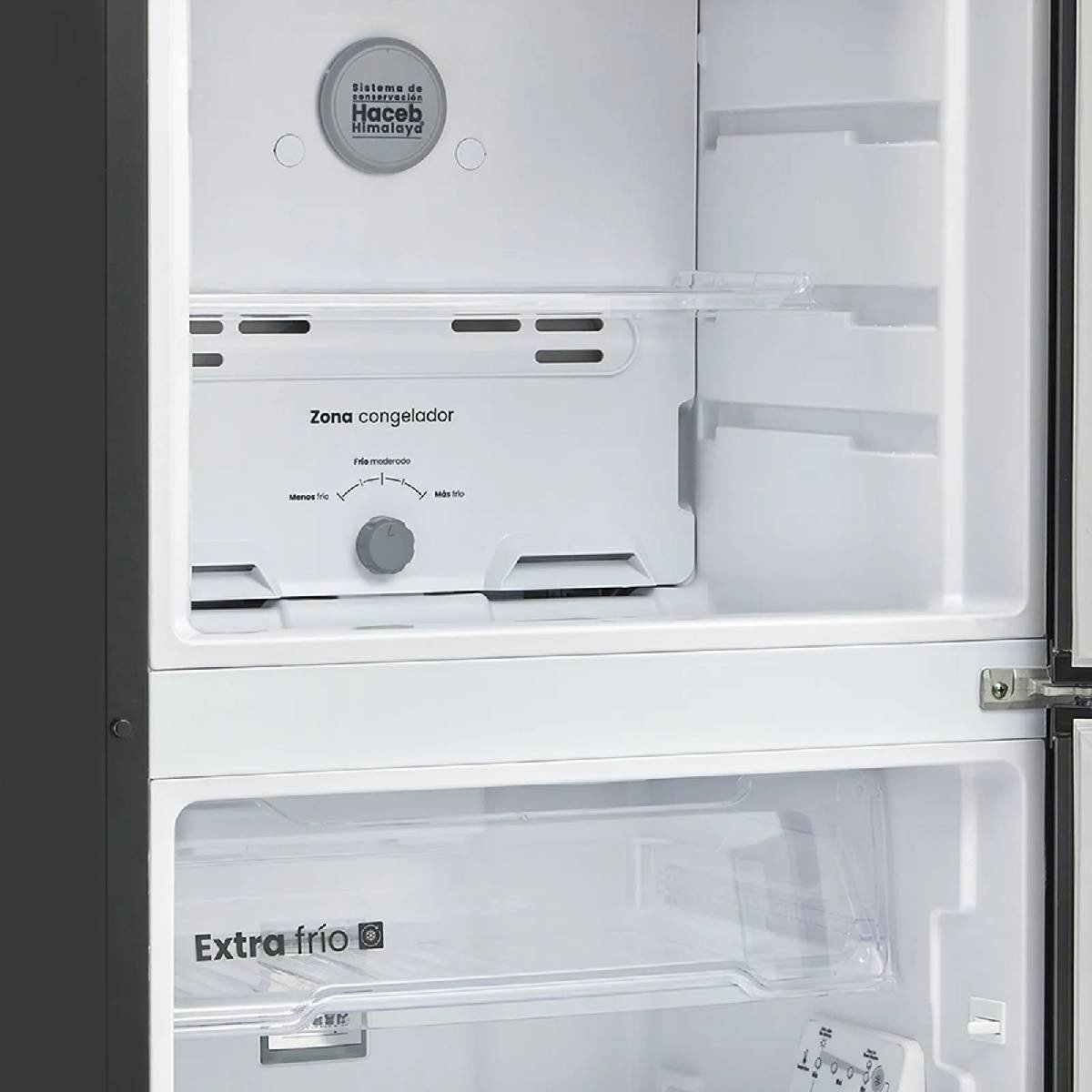 Incorpora el avanzado Sistema de Conservación Haceb Himalaya, que combina frío sectorizado, temperatura estable por zonas, corrientes de aire óptimas, compartimiento Extra Frío y bandeja para frutas y verduras con control de humedad, manteniendo los alimentos frescos por más tiempo. Su panel digital interno facilita un control preciso de la temperatura e incluye función de enfriamiento rápido.
