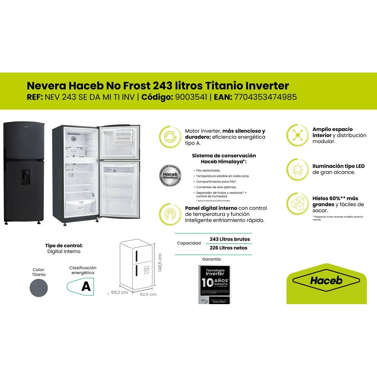 La Nevera Haceb 243 Litros No Frost Titanio Inverter NEV 243 SE DA MI TI INV ofrece eficiencia, frescura prolongada y un diseño moderno con manija integrada. Su motor Inverter y clasificación energética A permiten un funcionamiento más silencioso, mayor durabilidad y hasta 67% de ahorro energético. La tecnología No Frost garantiza refrigeración uniforme sin formación de escarcha.